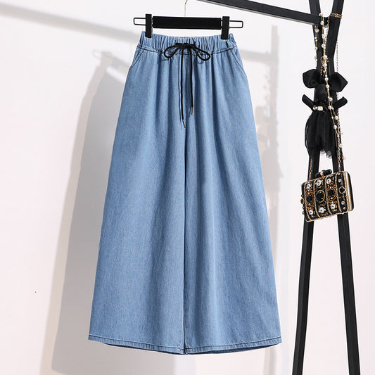 Fashionable And Comfortable Large Size Women's Lace-Up Ultra-Thin Fabric Elastic Waist Casual Denim Cropped Pants